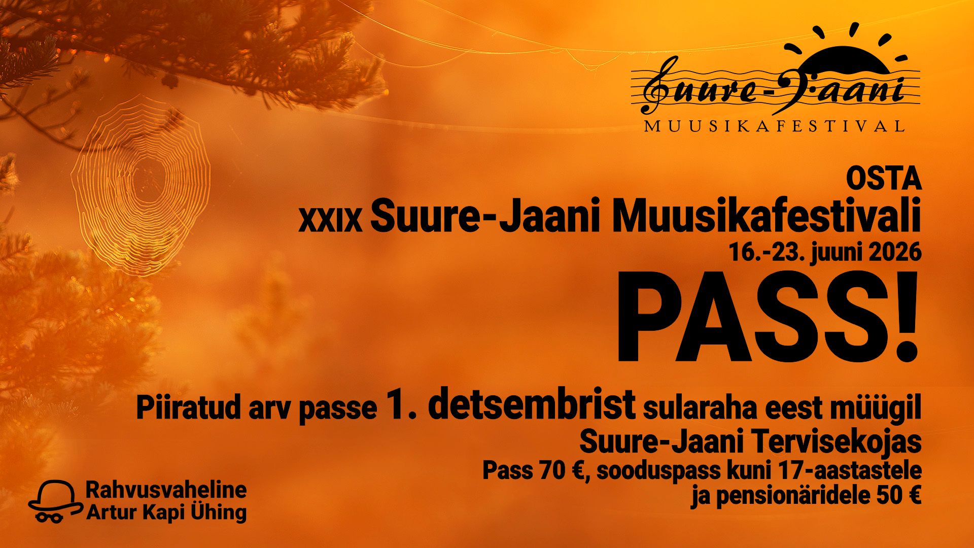 Alates 1. detsembrist saab Suure-Jaani Tervisekojast osta 16.-22. juunil 2024 toimuva Suure-Jaani muusikafestivali passe. Passi hind 60 eurot, sooduspass kuni 18-aastastele ja pensionäridele 40 eurot.